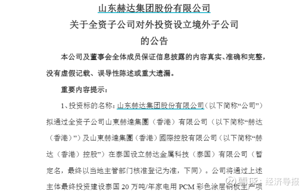 公告显示,赫达(泰国) 注册地址位于泰国罗勇府伟华东海岸工业区四区,经营范围(包括但不限于)生产、销售家电用PCM彩色涂层钢板,由赫达(香港)持股95%,赫达(香港)控股持股5%。