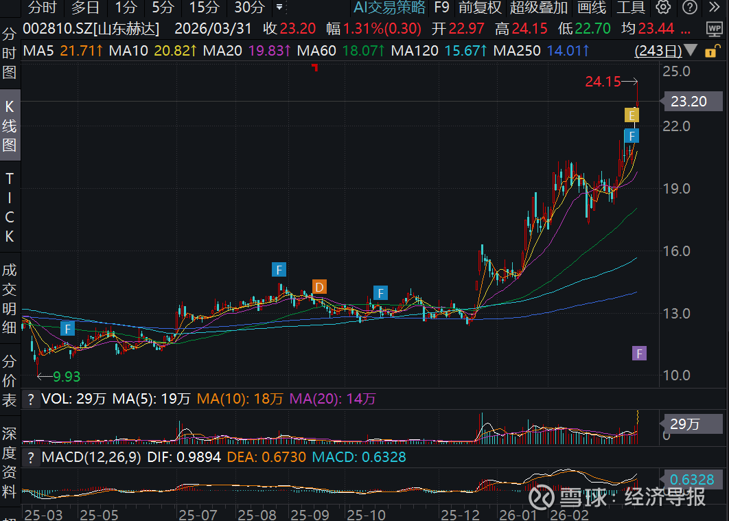 股价方面,3月30日,山东赫达实现“10cm”涨停;3月31日,公司股价继续上涨,盘中触及近1年最高价24.15元,较2025年4月9日股价最低点9.93元大涨143.20%。