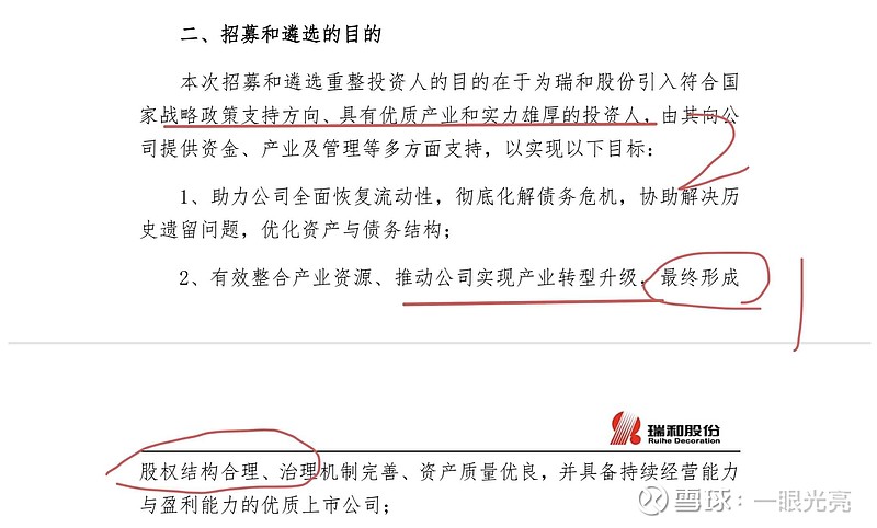 1、瑞和的大股东及一致行动人持股比例达到40%,这40%基本上动不了,全部质押或冻结。瑞和的招募公告里面有句话:最终形成股权结构合理 …的优质上市公司(图标准1)。这句话对瑞和重整资本公积转赠非常关键,表明现在的大股东占40%是不合理的,这部分股份在重整时,通过存量权益调整让渡给产投方(或其他)让其实现控股,这就大大降低了转赠比例(比如原本10转10,因为让渡变成10转8)股本降低,股价上升空间提高。