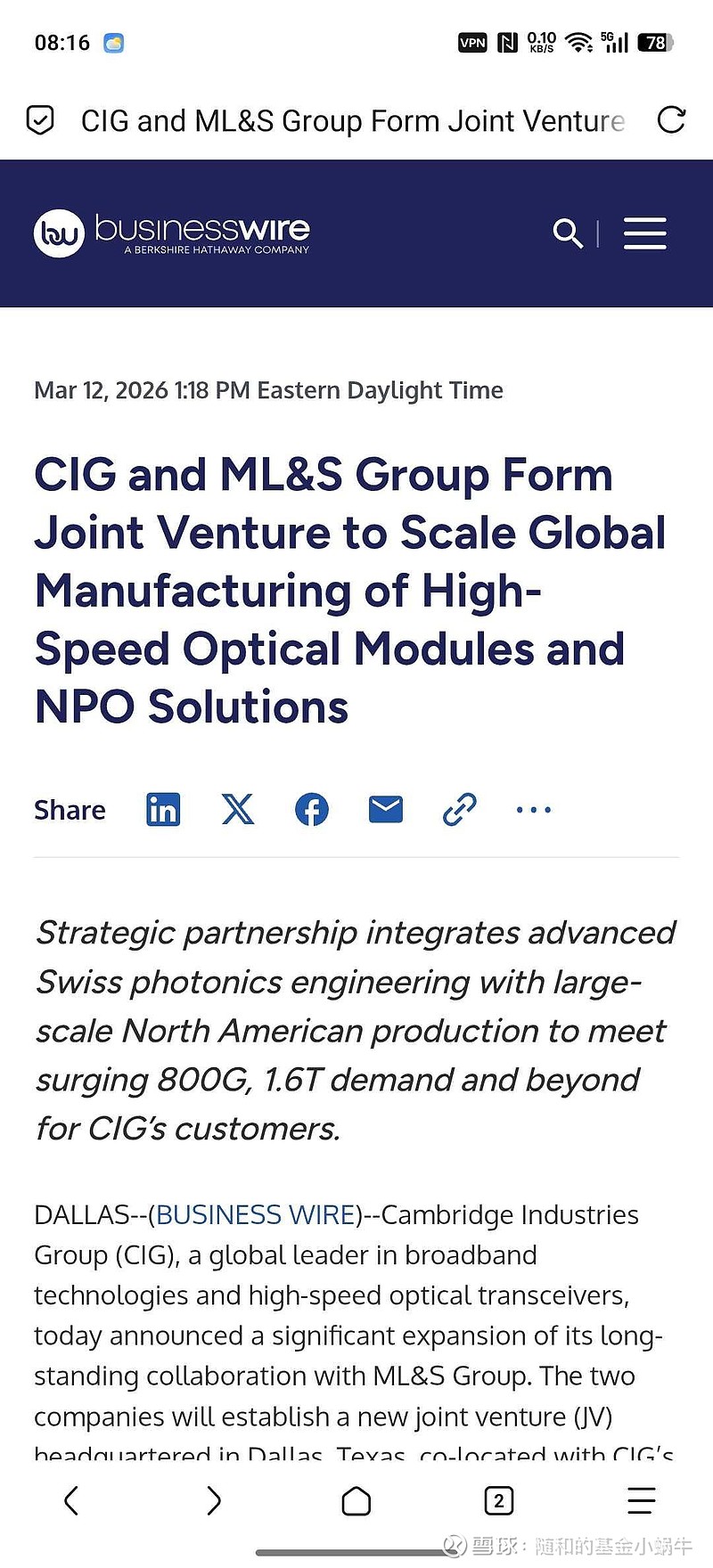 CIG董事长兼首席执行官黄志光(Gerald Wong)表示:“CIG与ML&S自德国合作起步,20年来建立了互信共赢的合作基础。人工智能时代推动数据中心网络向1.6T及更高速率升级,本次合资公司将精准匹配客户需求,提供规模化、高精密的产品供应能力。”