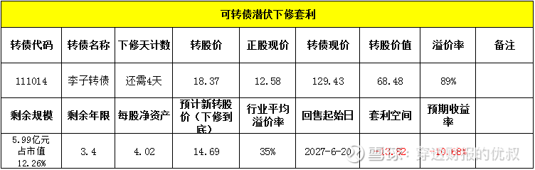 这次距离满足下修条件,还剩7天,现在的转股溢价率是22%,如果接下来的交易日里,满足下修条件的话,预计新转股价能下修到18.25元/股,下修后的转股溢价率预计能在20%,毕竟还有3.44年的期权价值。