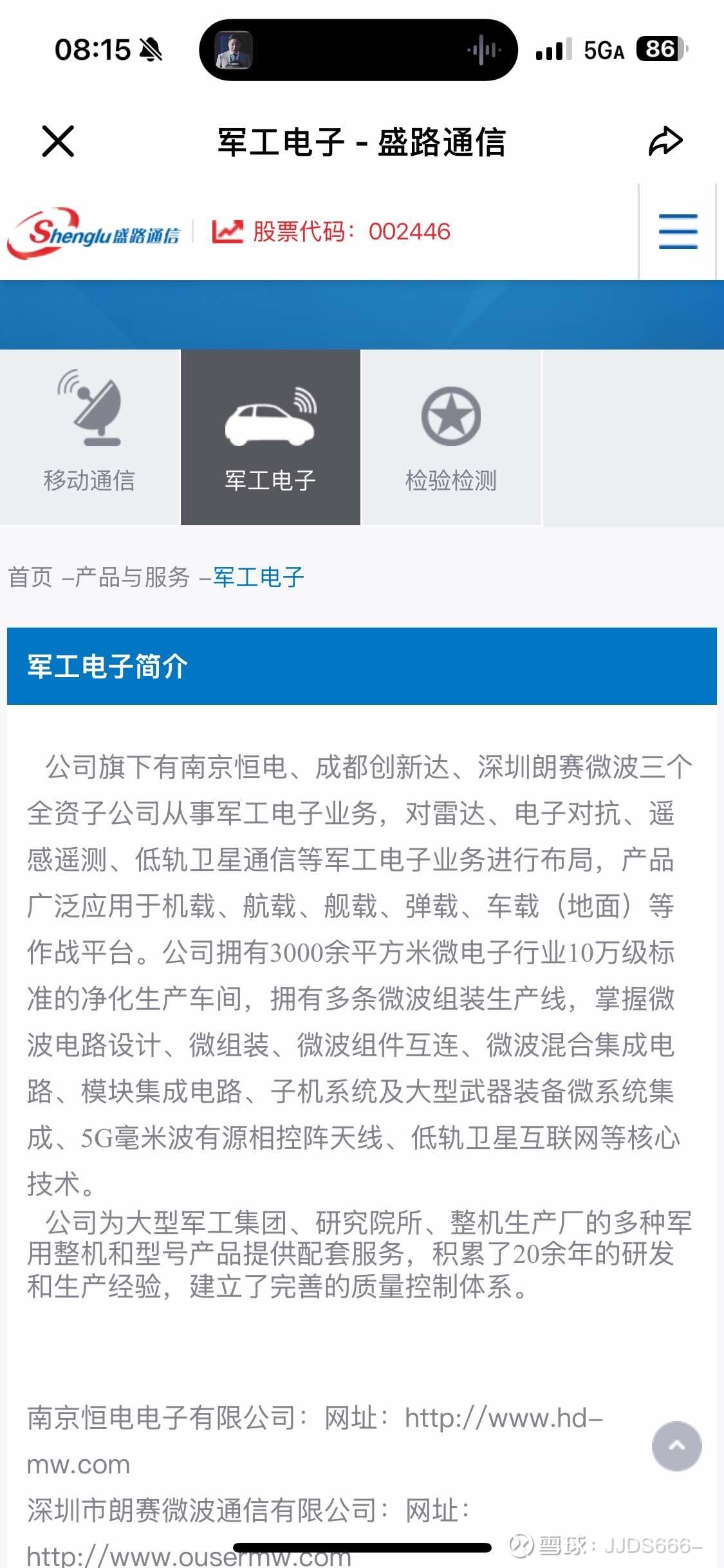 盛路通信旗下有南京恒电、成都创新达、深圳朗赛微波三个全资子公司从事军工电子业务,对雷达、电子对抗、遥感遥测、低轨卫星通信等军工电子业务进行布局,产品广泛应用于机载、航载、舰载、弹载、车载(地面)等作战平台。公司拥有3000余平方米微电子行业10万级标准的净化生产车间,拥有多条微波组装生产线,掌握微波电路设计、微组装、微波组件互连、微波混合集成电路、模块集成电路、子机系统及大型武器装备微系统集成、5G毫米波有源相控阵天线、低轨卫星互联网等核心技术。$通宇通讯(SZ002792)$ $雷科防务(SZ002413)$ $*ST铖昌(SZ001270)$