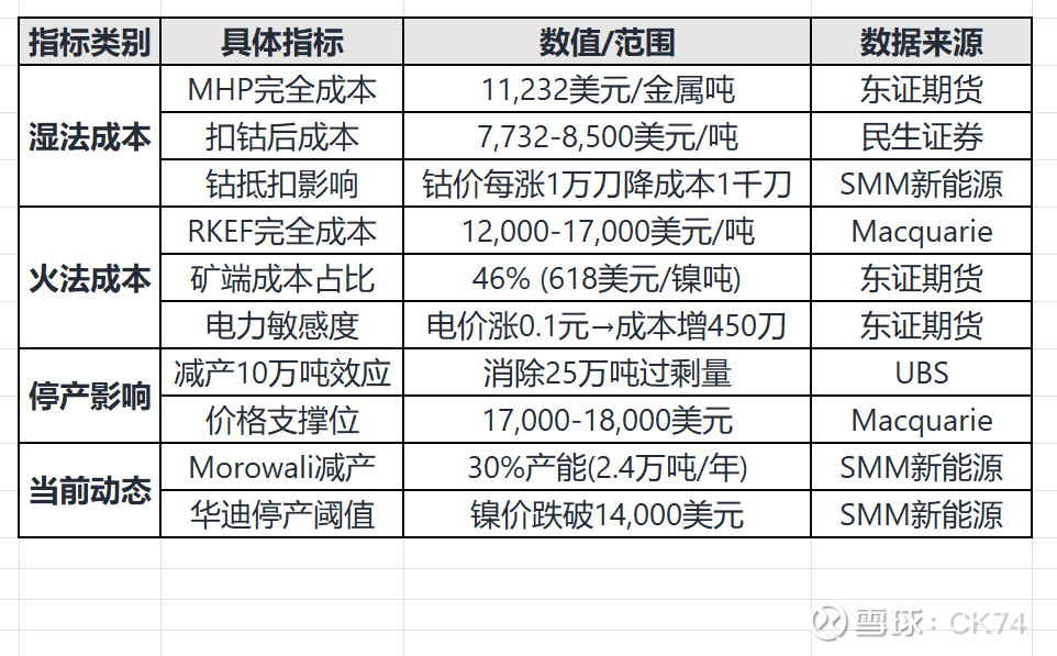 表:印尼镍项目成本与停产影响核心指标