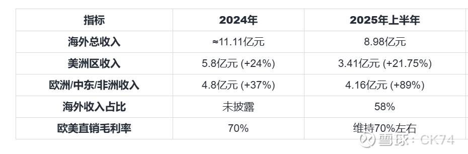 2024年:海外总收入约11.11亿元(推算自美国收入占比)。分区域看:美洲区收入5.8亿元,同比增长24%;欧洲、中东及非洲区收入4.8亿元,同比增长37%;亚太区(不含中国)收入未单独披露,但亚太整体收入14.4亿元(含中国),同比增长6%。
