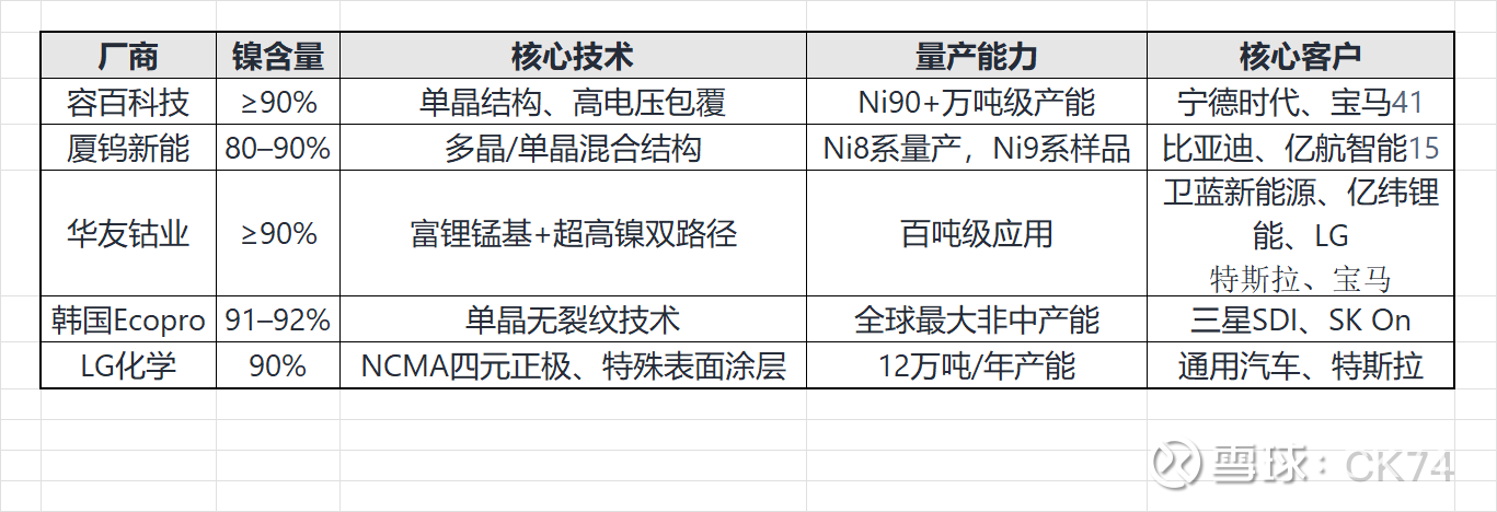 厂商镍含量核心技术量产能力核心客户