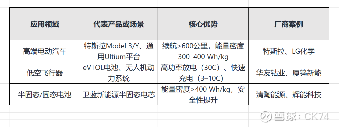 超高镍三元正极主要应用于高能量密度需求场景,覆盖动力电池、低空飞行器及前沿技术领域: