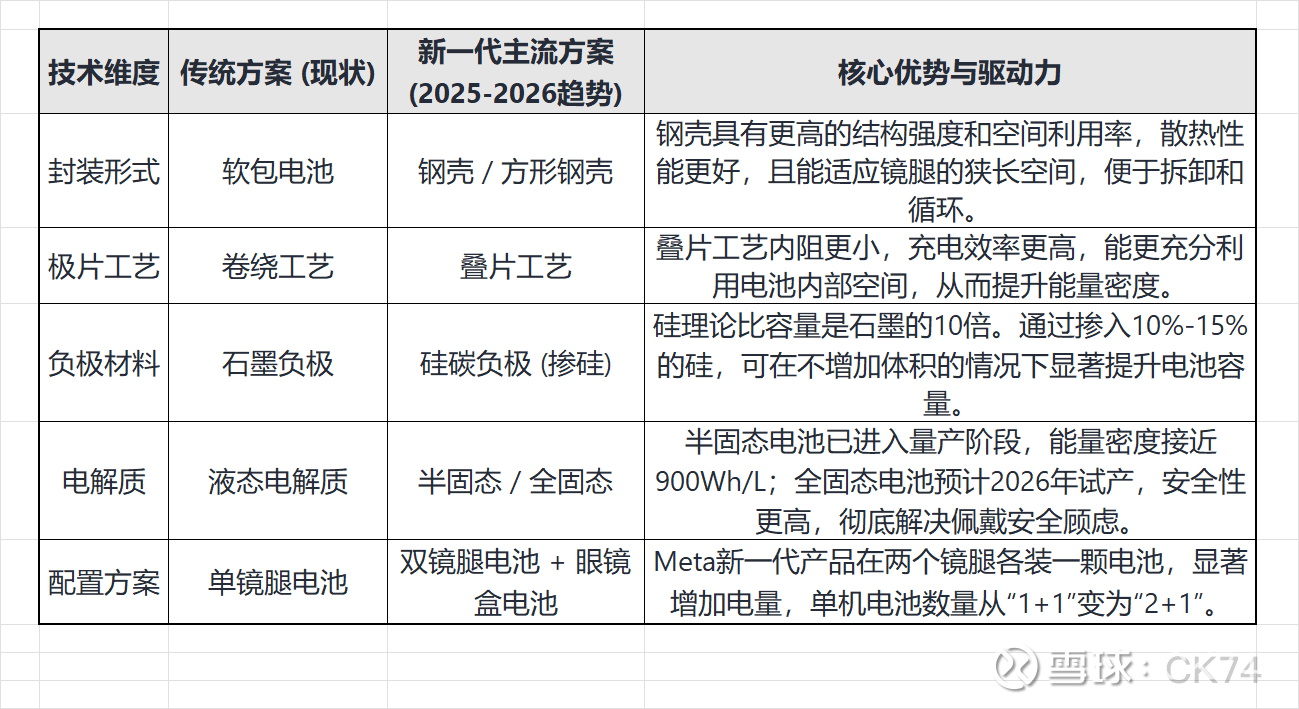 AI眼镜电池市场正在经历从“通用标品”向“高端定制”的转变。钢壳叠片和半固态技术是当前的核心增量方向。