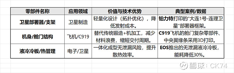 在航空航天领域,3D打印的高价值应用主要集中在动力系统(火箭/飞机发动机)和复杂结构件。其中,火箭发动机因其结构复杂、耐高温高压要求,是3D打印价值量最大的单一场景。