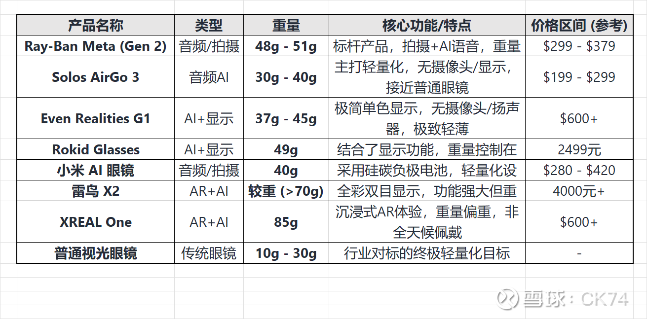 表1:2025年主流AI/AR眼镜重量与规格对比