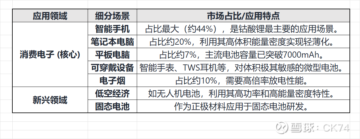 钴酸锂电池的应用高度集中在小型、便携式电子设备中,并正向新兴领域拓展。