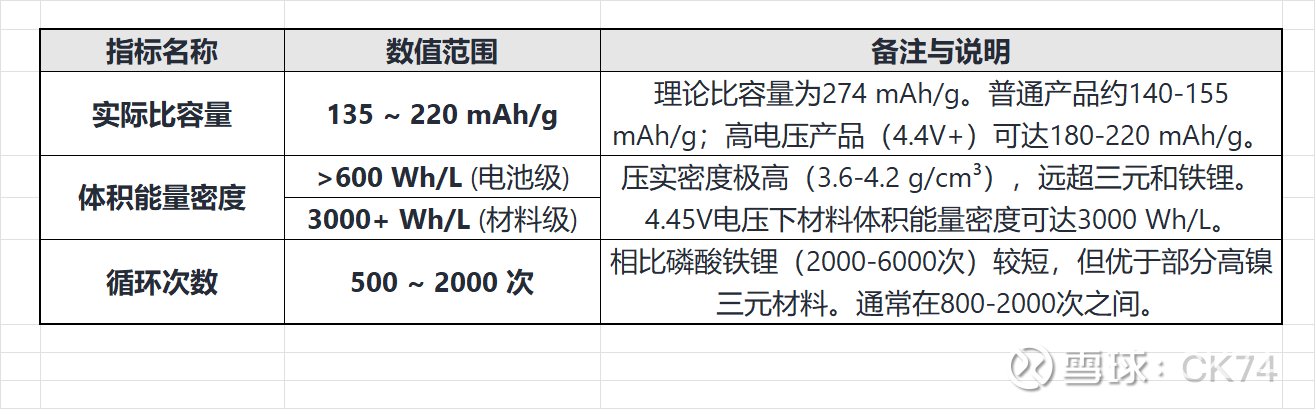钴酸锂的能量密度数据需区分质量能量密度(Wh/kg)和体积能量密度(Wh/L),后者是其核心竞争力。