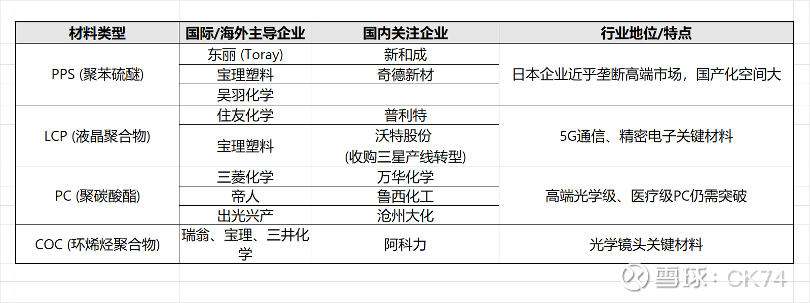国产替代机遇明确:在PPS、LCP、高端PC等领域,日本企业(如东丽、三菱、住友)长期占据主导地位,但中国企业(如新和成、万华化学、普利特)正在通过技术突破和产能扩张切入高端市场。