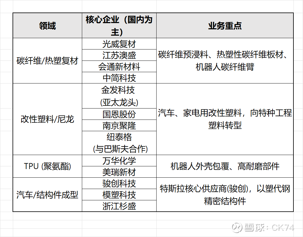 涉及碳纤维、玻纤增强及汽车/机器人轻量化结构件。