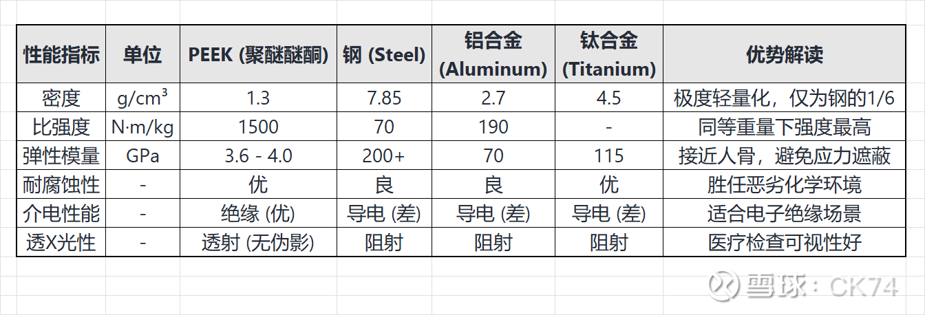 在医疗植入领域,PEEK相比钛合金具有独特优势: