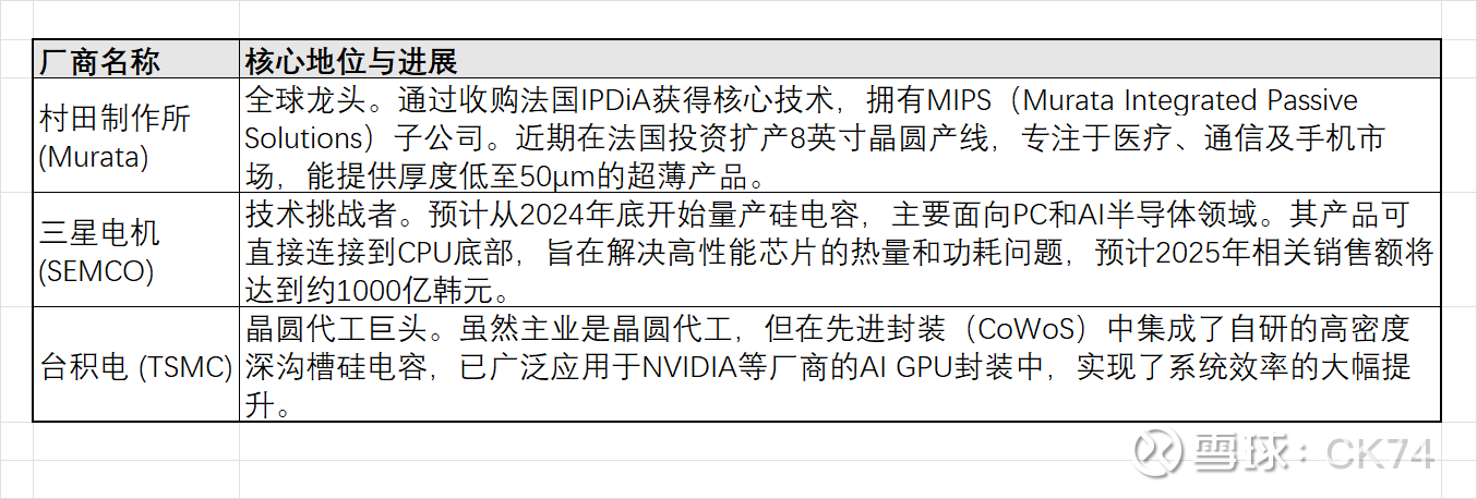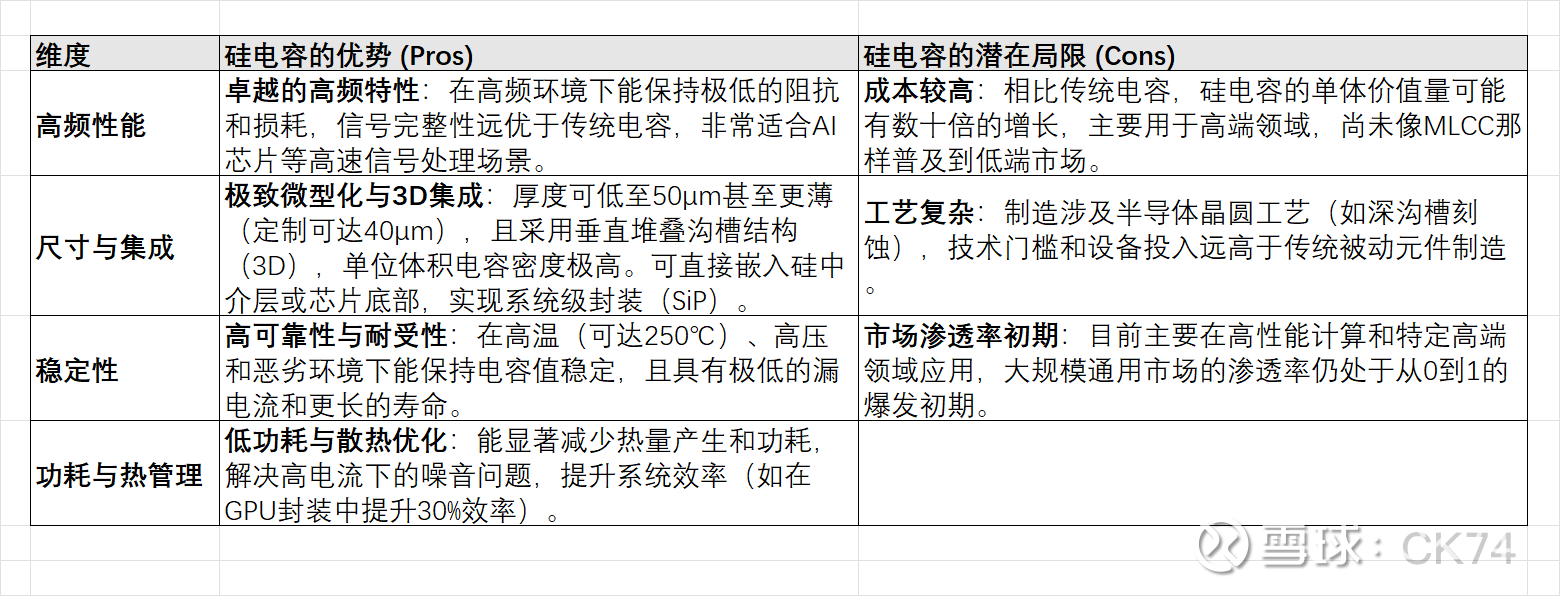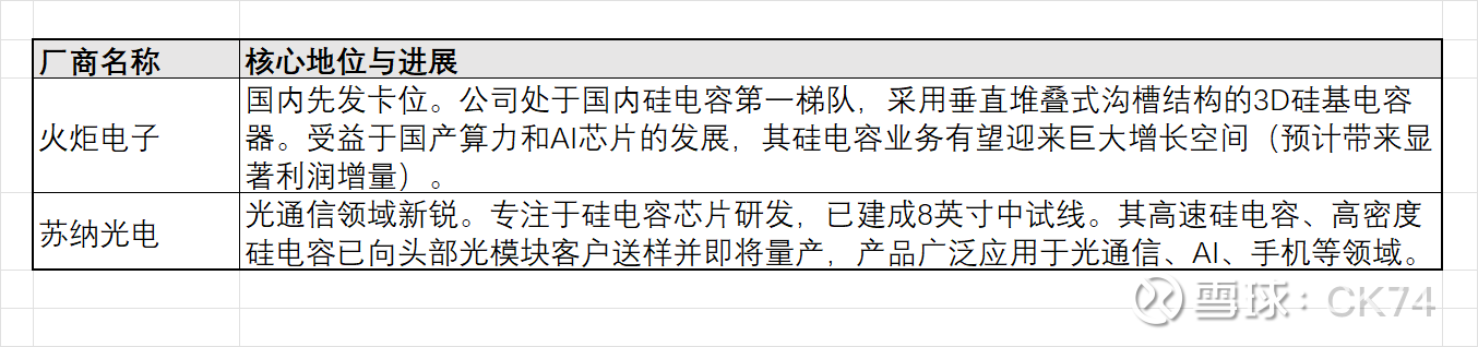 总结:硅电容凭借其高频、小型化、耐高温的特性,正在成为AI时代解决芯片供电和信号完整性问题的关键被动元件。虽然成本较高,但在台积电、村田、三星等巨头的推动下,以及火炬电子、苏纳光电等国内厂商的突破下,其在AI服务器、光模块和高端消费电子中的渗透率将快速提升。