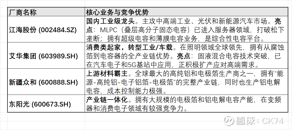 铝电解电容正处于技术升级的关键期。虽然其高频特性差和寿命限制是固有短板,但通过固态化和混合化技术改进,其在AI服务器(大电流滤波)和新能源汽车(耐高温高压)中的地位不可替代。市场格局上,江海股份和艾华集团等国内龙头正通过技术突破,逐步在高端工业和车载领域替代日系份额。