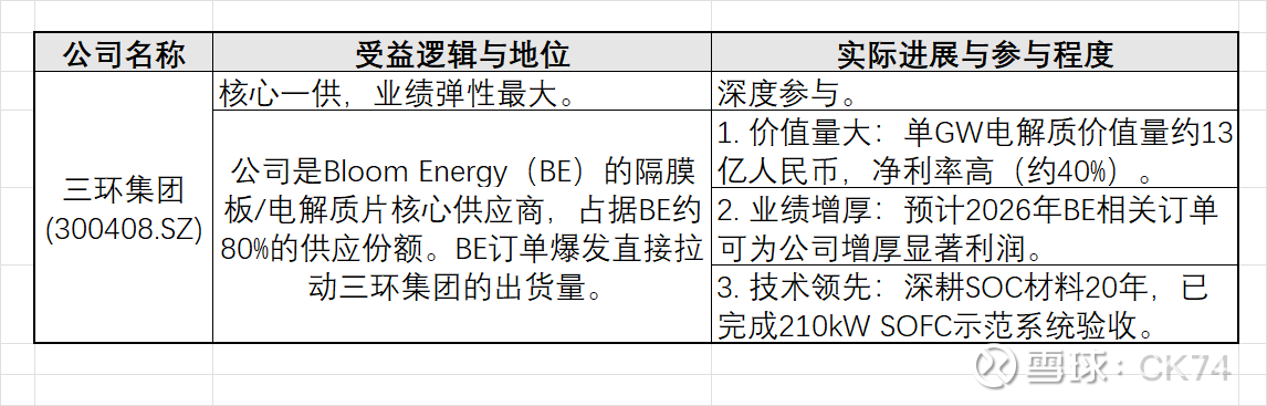 首选逻辑(确定性最高):三环集团。作为全球SOFC龙头Bloom Energy的核心一供,其受益逻辑最硬、业绩兑现最快。随着BE在2025-2026年产能翻倍(从1GW到2GW),三环集团的相关业务有望迎来量利齐升。