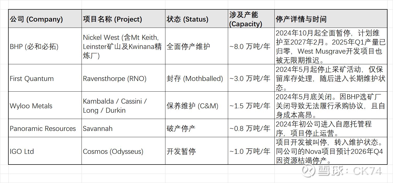产能出清规模:仅BHP、First Quantum和Glencore三家巨头的停产项目,就已从市场上移除了超过14万吨/年的镍金属产能。