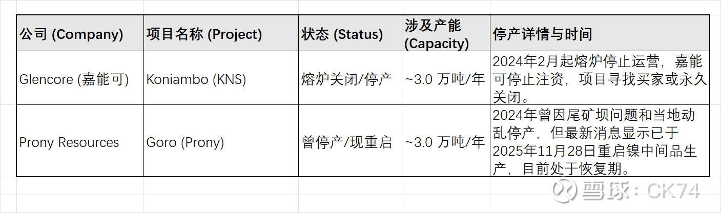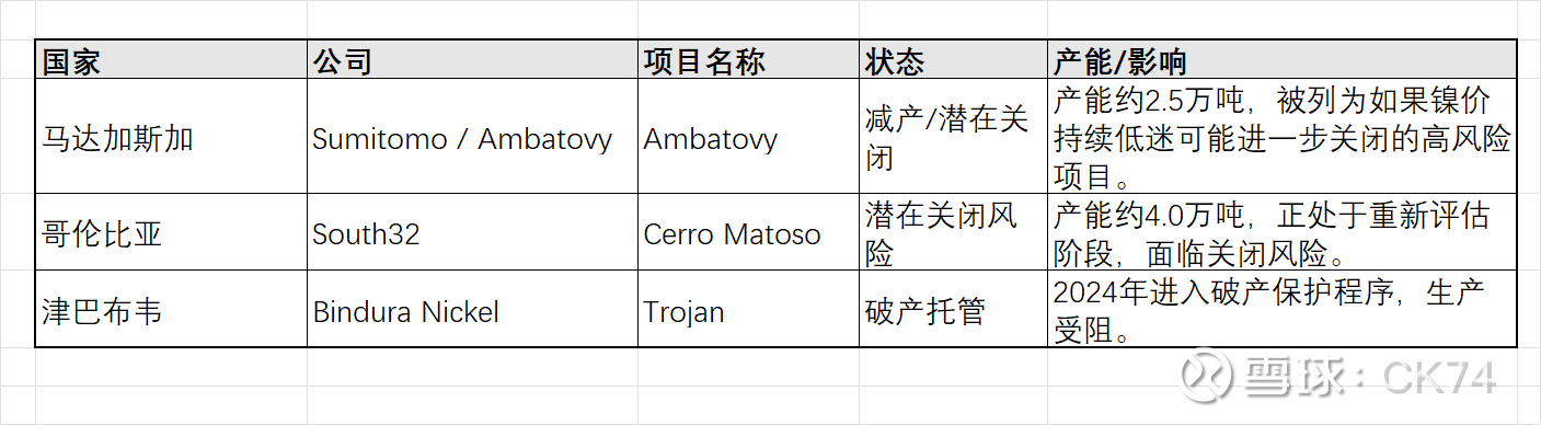 停产原因对比: 印尼:“有矿不能采”——受限于RKAB审批速度和环保合规要求,属于政策性供给约束。 非印尼:“采了就亏钱”——受印尼低成本镍(尤其是HPAL工艺带来的MHP)冲击,高成本硫化镍矿和传统镍铁项目已无利可图,被迫退出市场。