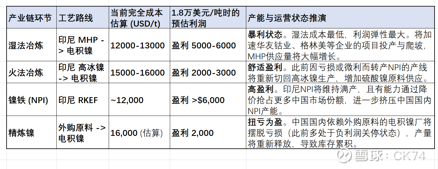 若镍价回升至1.8万美元/吨(约18,000 USD/t),将突破当前产业链绝大多数环节的成本线,标志着行业从“成本支撑逻辑”转向“高利润驱动逻辑”。这将引发从矿端到冶炼端的全面利润修复与产能释放,同时也可能加剧远期的供应过剩风险。
