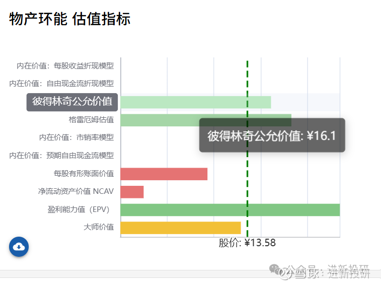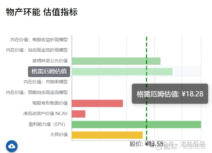 格雷厄姆估值模型:这个方法不看公司未来的增长潜力,只非常保守地看它现在账面上有多少家底(每股净资产) 和现在每年能赚多少钱(每股收益)。当前这家公司的家底有18元,而现价卖13元。因此也是低估