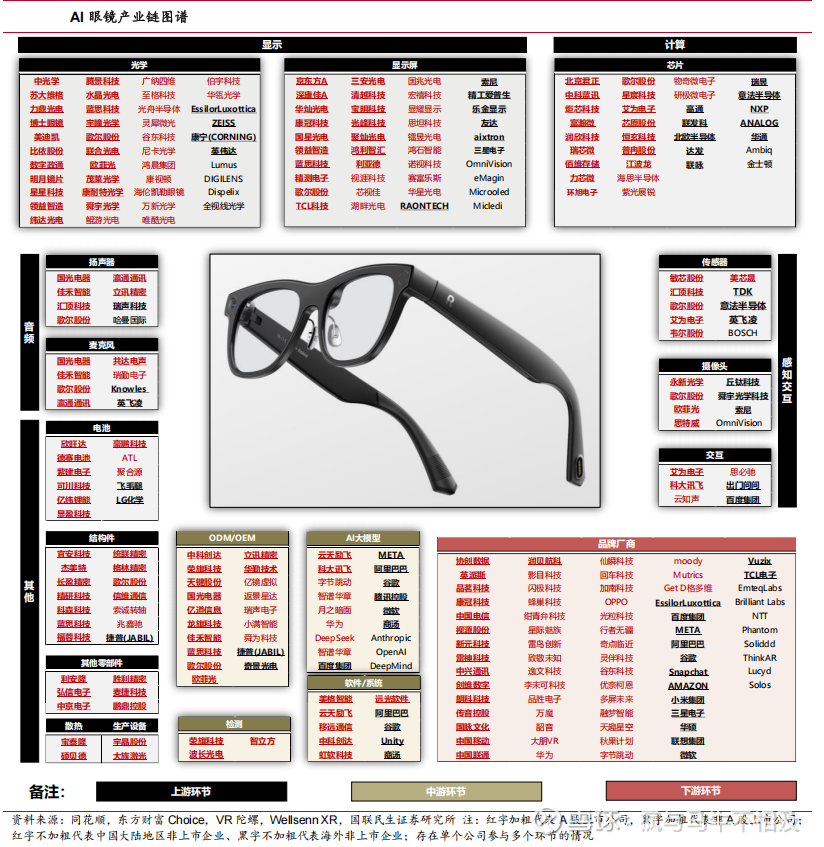 下游品牌端竞争激烈,短期难分胜负。对于A股投资者而言,更值得关注的是“科技厂商+传统眼镜品牌”的合作模式带来的间接机会,比如为品牌厂商提供渠道支持的视光连锁企业,或为终端产品提供配套服务的企业。长期来看,具备“硬件+软件+服务”闭环生态的企业,有望在行业成熟后脱颖而出。