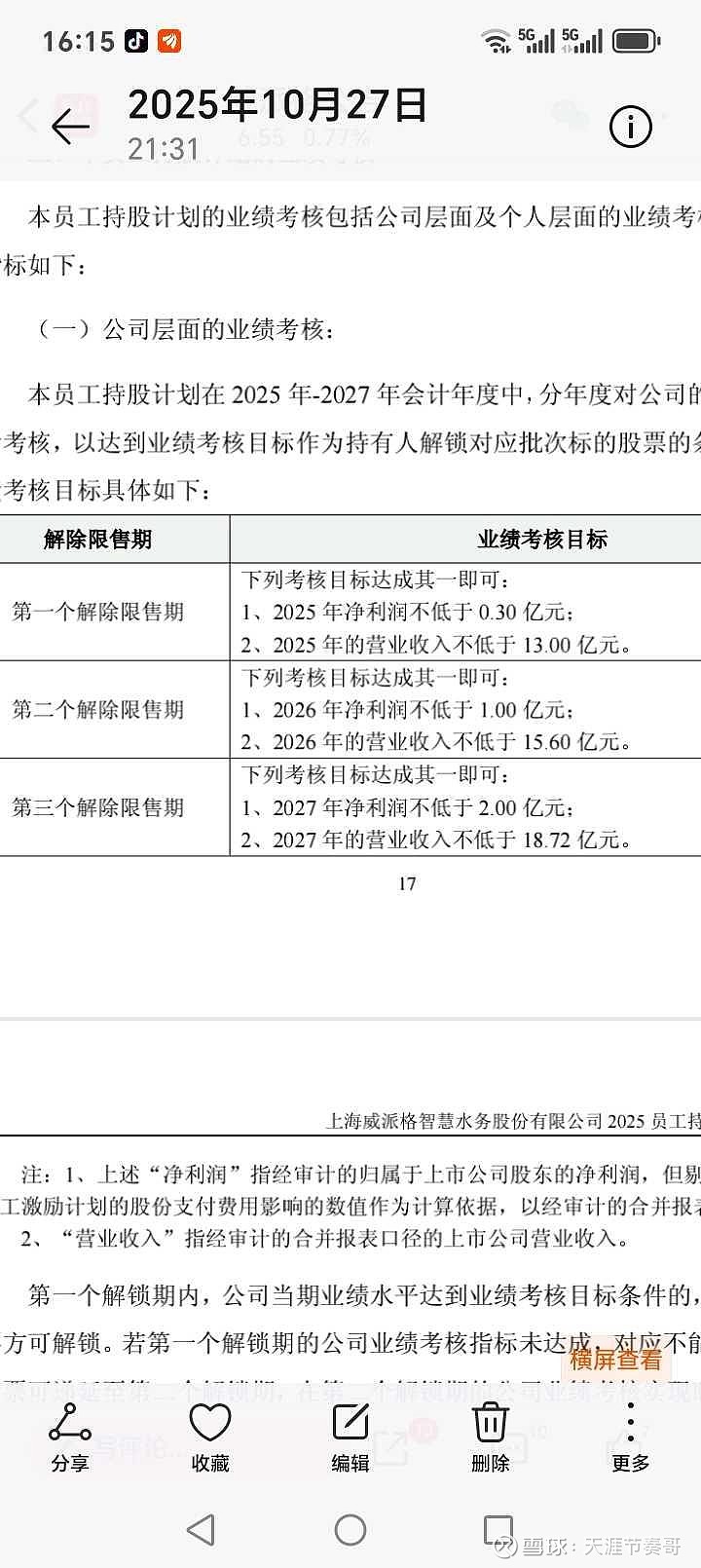 $威派格(SH603956)$ 2025年绩效考核是净利润不低于0.3亿或营业收入不低于13亿,满足其中之一即可。