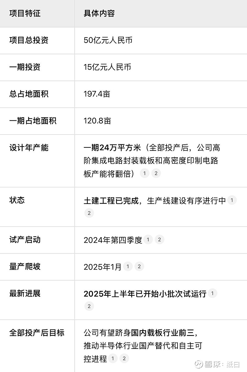 总投资50亿,占地近200亩,一期年产能24万平方米,项目已于今年上半年开始小批次试运行,全部投产后,公司有望跻身国内载板行业前三。