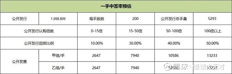 公开发行总计105.86万股,每手200股,公开发行总计5293手,当前超购49倍,假设10000人申购,一手中签率50%。