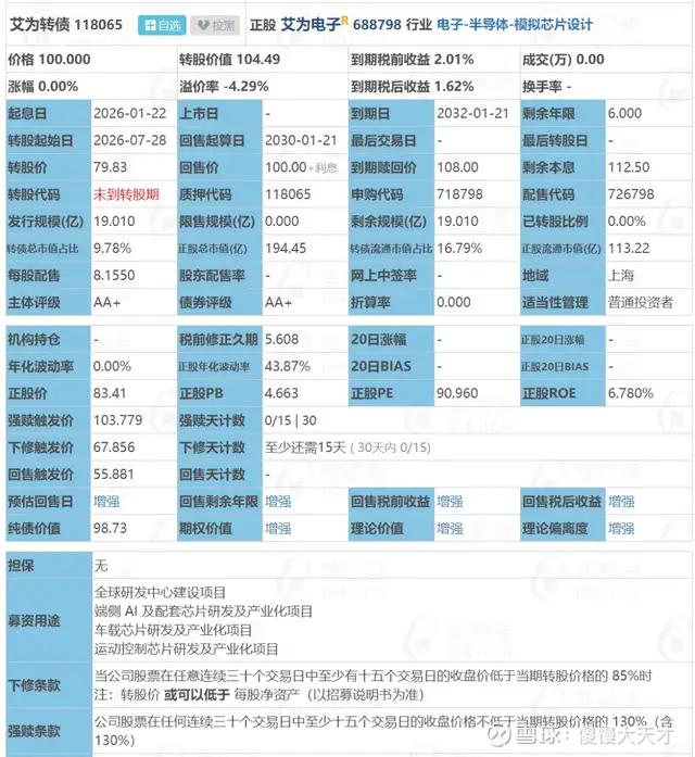 艾为电子今日收盘价83.41,转股价79.83,转股价值=转债面值/转股价*正股价=100/79.83*83.41=104.49,转股价值一般,可转债转股价值越高越好。