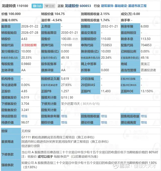 龙建股份今日收盘价4.85,转股价4.63,转股价值=转债面值/转股价*正股价=100/4.63*4.85=104.75,转股价值一般,可转债转股价值越高越好。