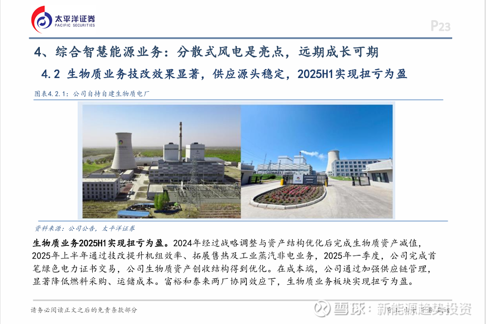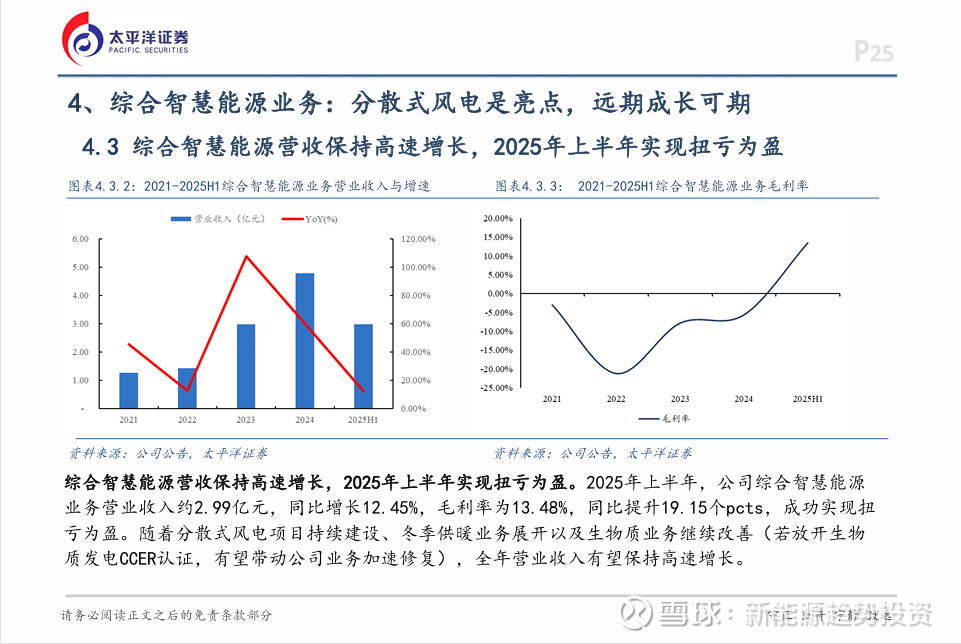 生物质业务方面,在收入端,通过技术改造增加连续发电时间、拓展供售热等非电收入;在费用端通过加强供应链管理,优化燃料采购、运输和存储成本。公司生物质资产创收结构得到优化,燃料收储成本有效降低,2025年上半年迎来营收与盈利双增长。随着分散式“风电+储能”、“风电+供热”等模式逐步展开,公司综合智慧能源业务营收与盈利有望保持增长。