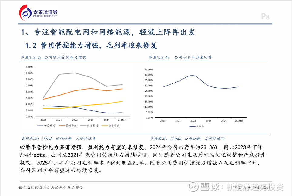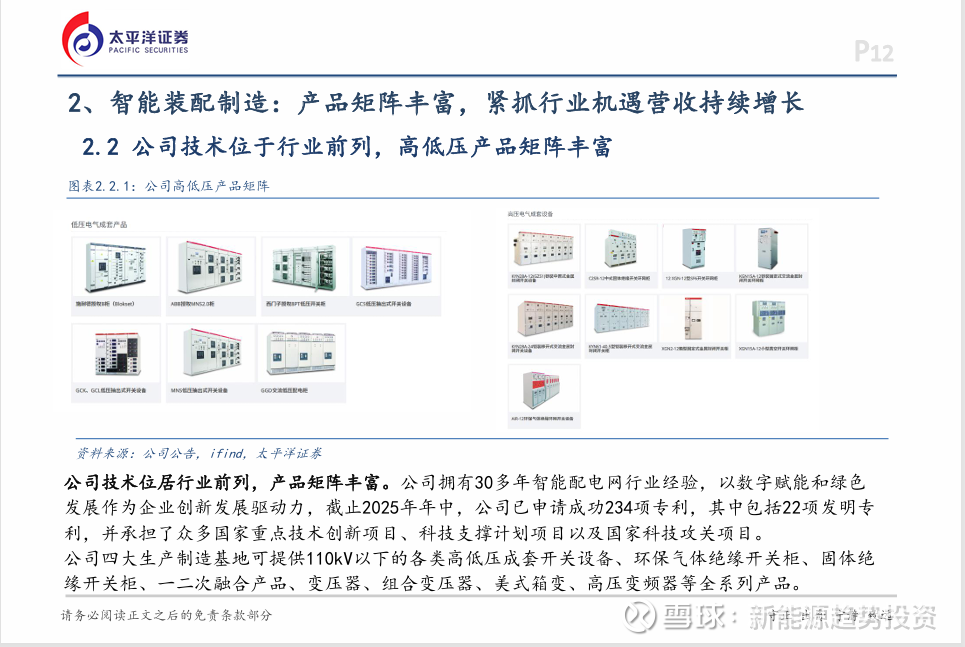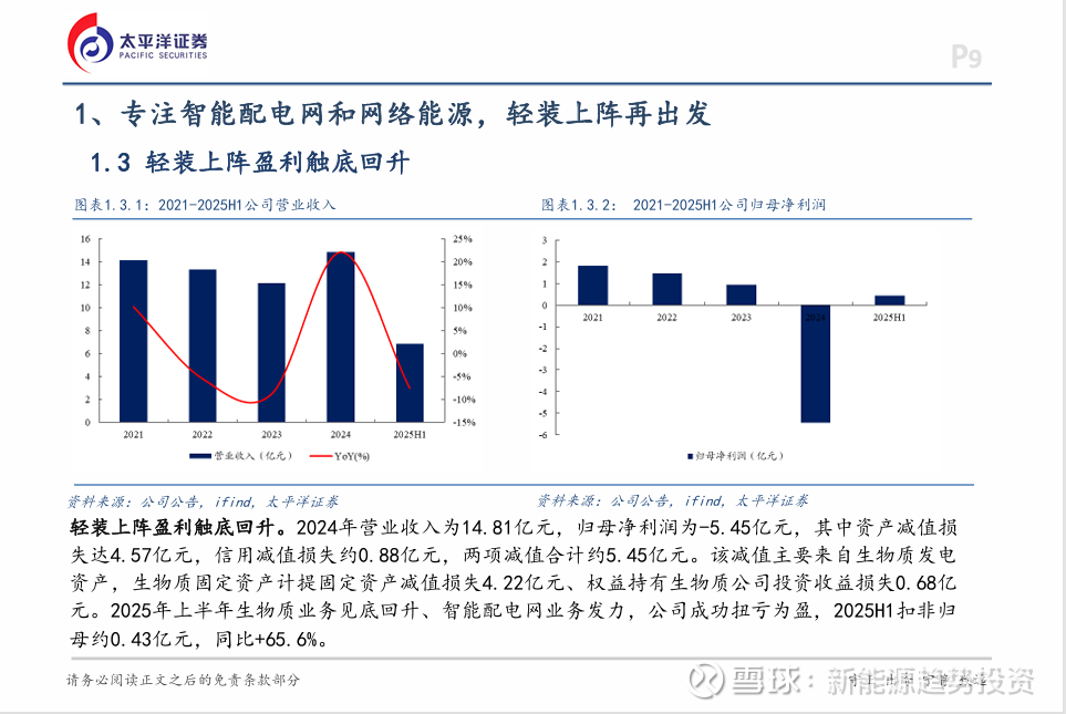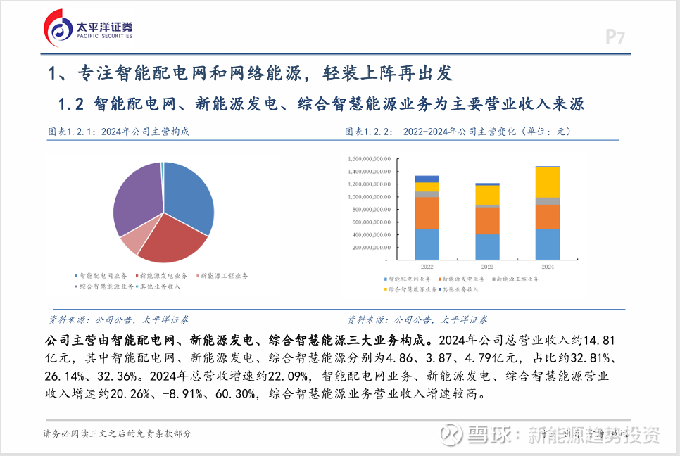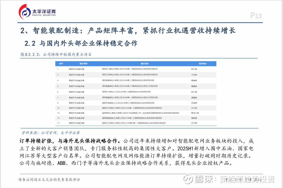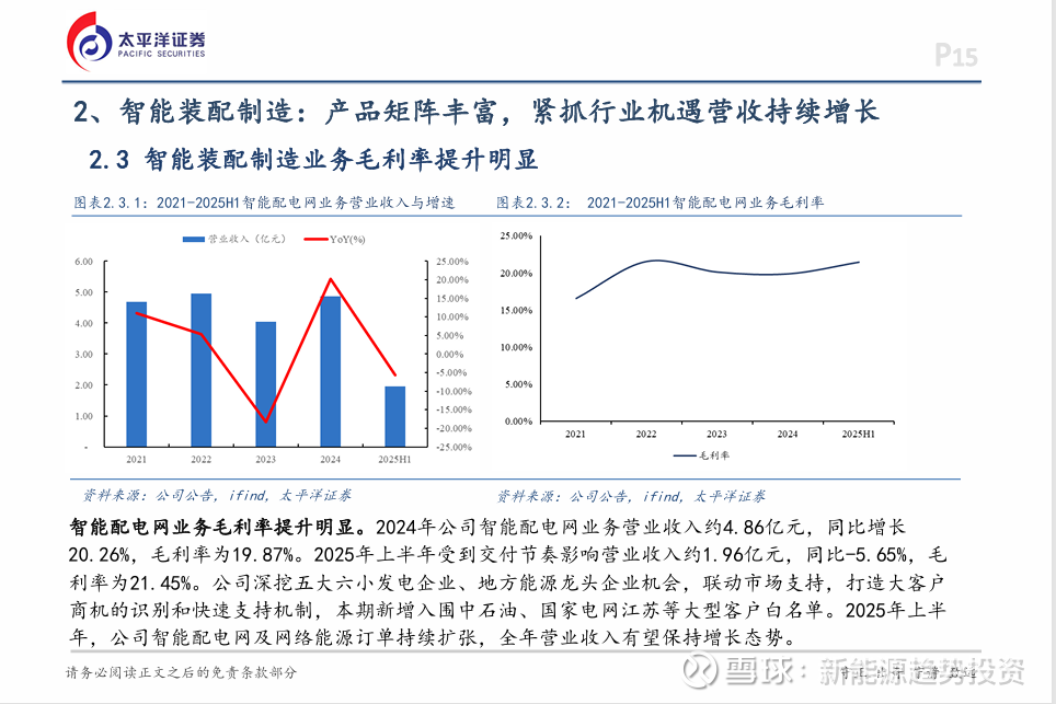 公司专注智能配电网和网络能源,主营可分智能装配制造、新能源发电、综合智慧能源三大业务。智能装配制造业务上,公司保持与国内外头部企业合作,技术达到国际领先水平,具备国际化智能电气成套设备生产基地。新能源发电业务上,公司具备丰富的可再生能源前期开发和建设施工经验,截止2025年6月,公司累计建设、控制和持有新能源电站装机容量超2.7GW。综合智慧能源上,截止2025年6月,公司生物质业务顺利扭亏为盈,在2024年完成技改、大额减值后,轻装上阵效果初显,分散式风电在手项目充裕,有力保障远期成长。