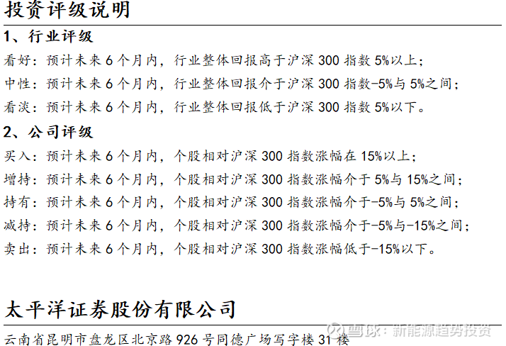本报告信息均来源于公开资料,我公司对这些信息的准确性和完整性不作任何保证。负责准备本报告以及撰写本报告的所 有研究分析师或工作人员在此保证,本研究报告中关于任何发行商或证券所发表的观点均如实反映研究人员的个人观点。报告 中的内容和意见仅供参考,并不构成对所述证券买卖的出价或询价。我公司及其雇员对使用本报告及其内容所引发的任何直接 或间接损失概不负责。我公司或关联机构可能会持有报告中所提到的公司所发行的证券头寸并进行交易,还可能为这些公司提 供或争取提供投资银行业务服务。本报告版权归太平洋证券股份有限公司所有,未经书面许可任何机 构和个人不得以任何形式翻版、复制、刊登。任何人使用本报告,视为同意以上声明。