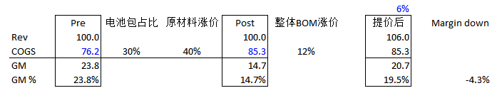 如果如图,由于通胀,成本占比30%的电池包大幅涨价40%,那么整体成本就上涨12%,也就是从76.2上涨到85.3。