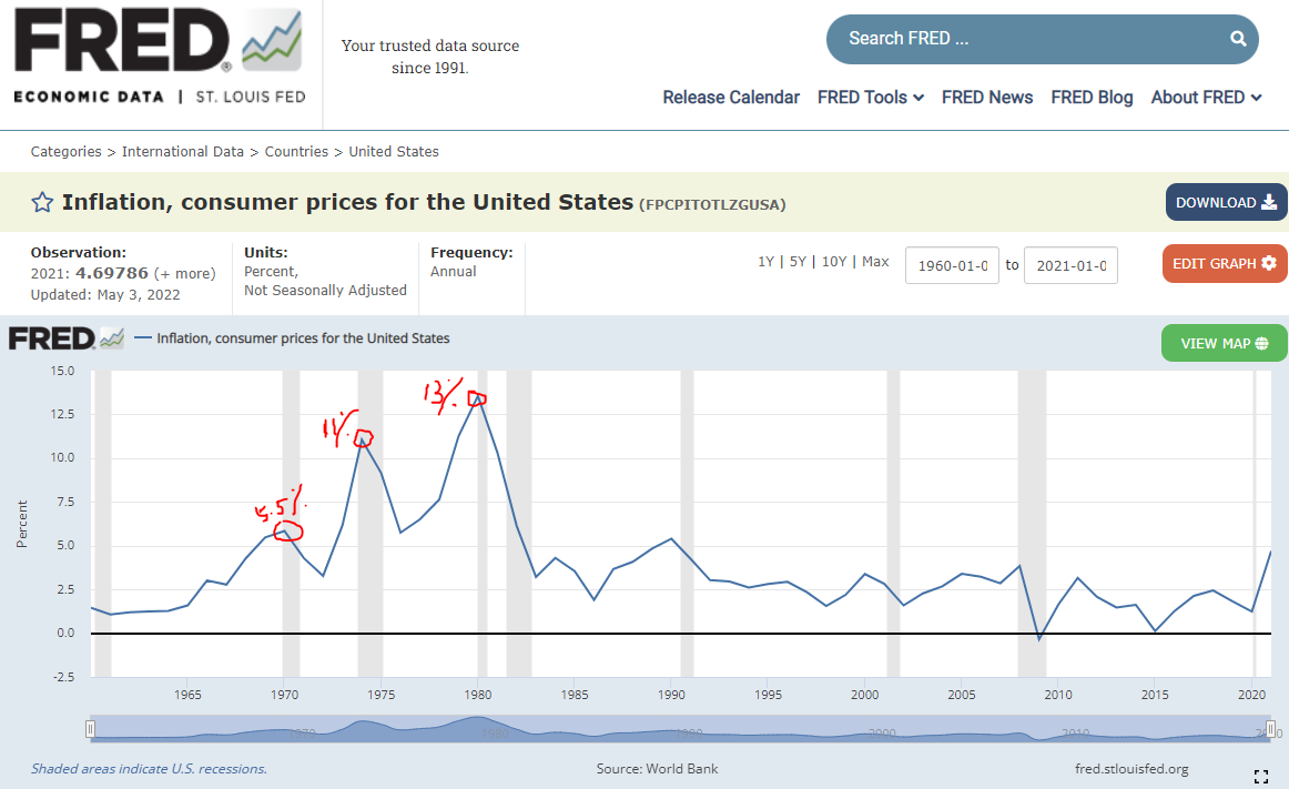 可以看到美国通胀从1972年的3%-4%,一下跳升到1974年的11%,和目前的情况非常类似。1979年又再次跳升到13%!