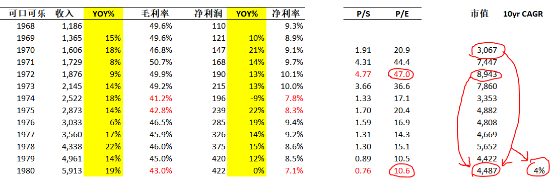 1970-1980,可口可乐收入从16亿上升到59亿,年复合14%。净利润从1.47亿上升到4.22亿,年复合11%。但如果你1970年以20.9倍买入可口可乐,到1980年,你的年复合回报为3.9%,大幅跑输通胀,欲哭无泪。