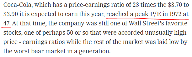 1972年,通胀到来前,可口可乐的估值是多少呢?47倍PE,有点海天的感觉了。