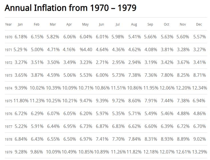 2,石油暴涨,直接的后果就是全球通胀暴涨,下图是美国1970-1980年CPI情况:
