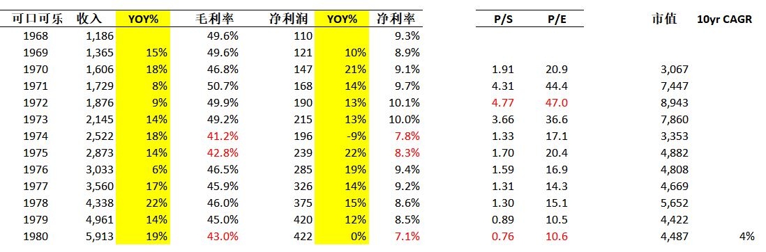 可口可乐1970-1980的收入增速基本在10%-18%左右,还不错,挺稳健。