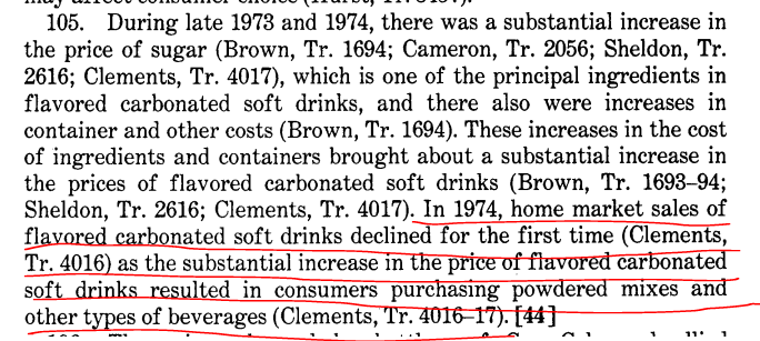 事实上,根据美国贸易委员会1974年的记录,由于价格上涨,碳酸饮料销量出现了首次下降。