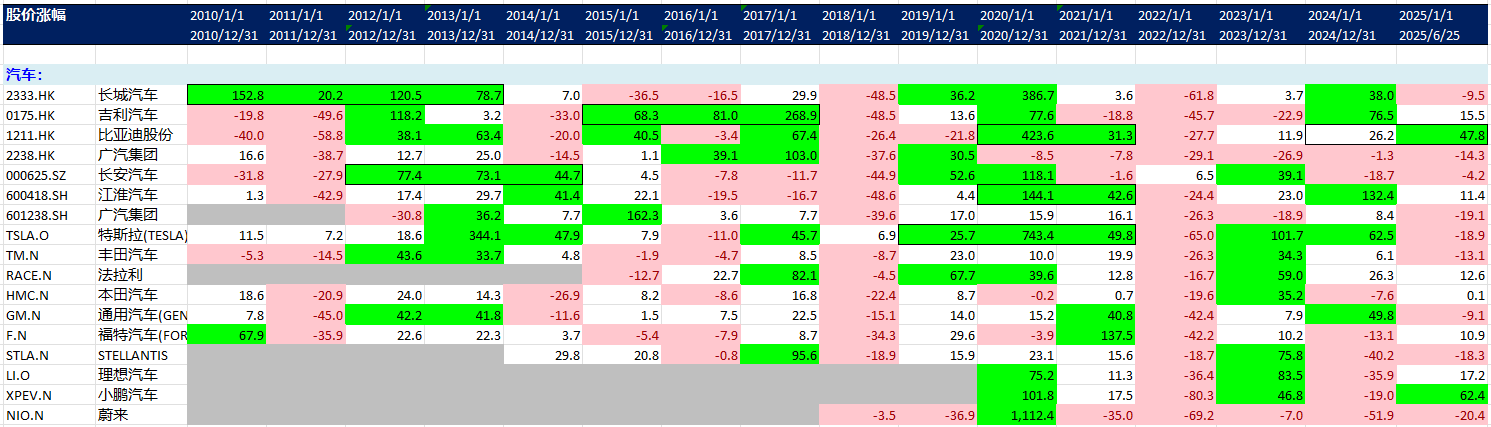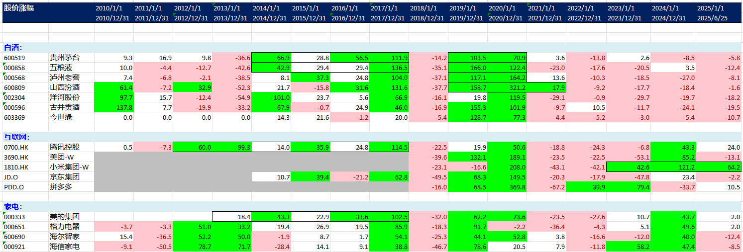 任何一个行业,如果研究跟踪住,其实都能获得相当好的回报。一个行业里,不同企业处于不同周期,股价也处于不同周期。以鞋服行业为例,以下是过去15年各个公司的涨幅——