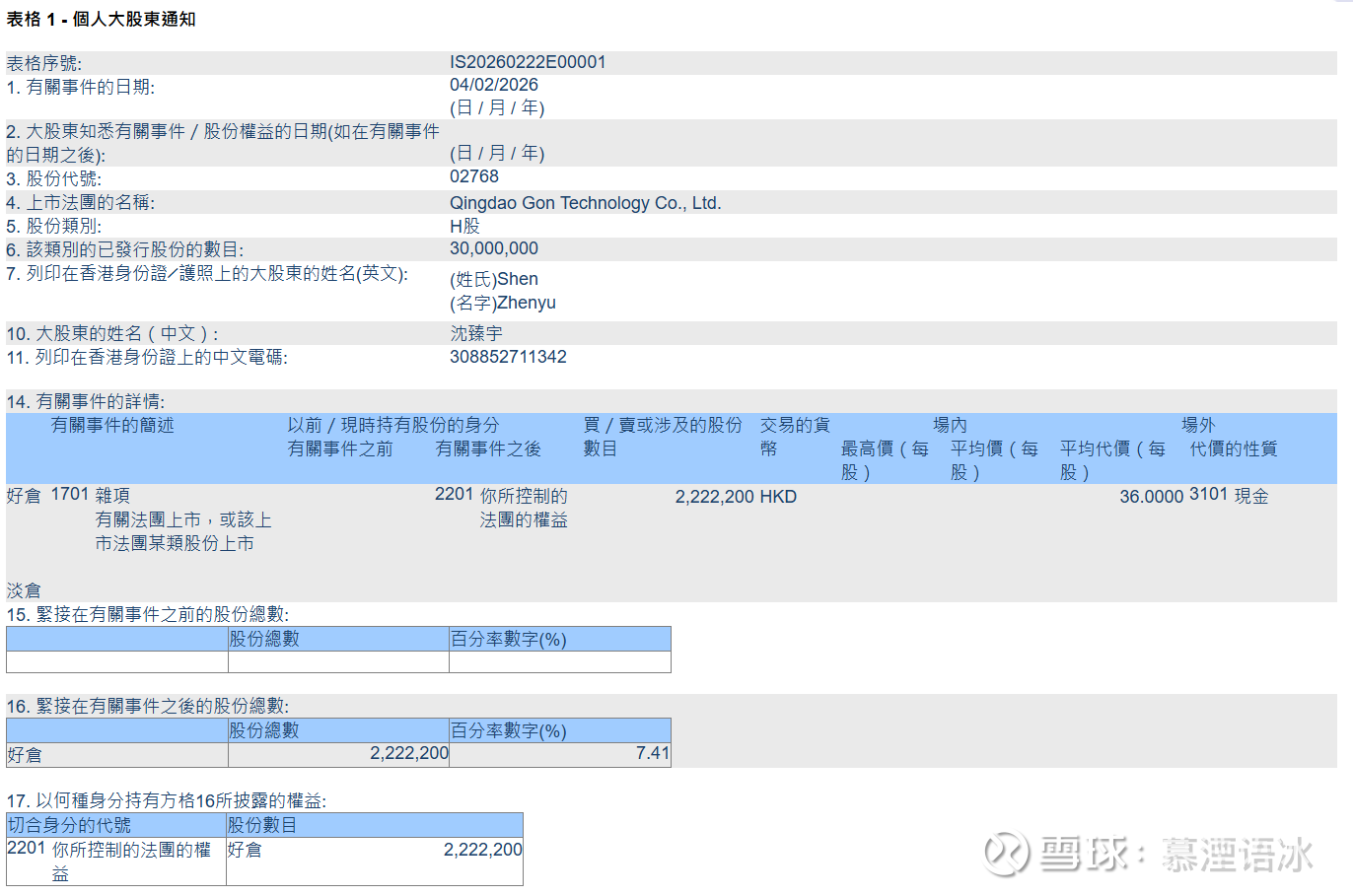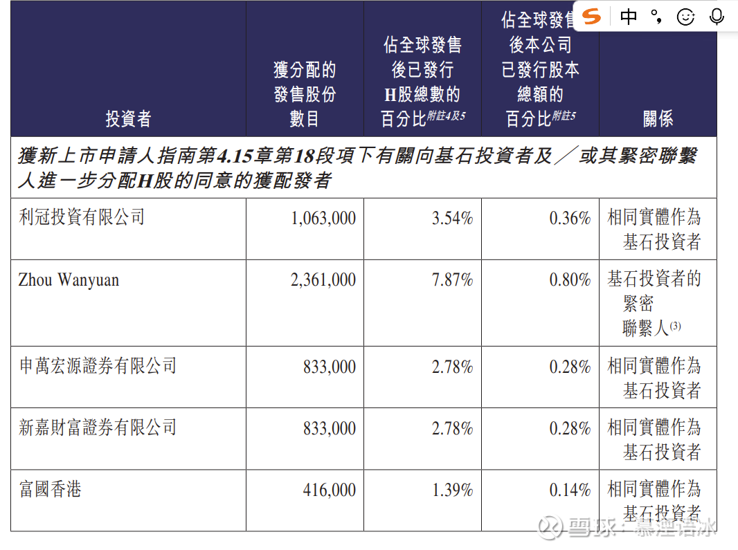 $国恩科技(02768)$ 沈小姐姐(A股大牛散),大手笔基石拿下2222200股,ipo成本价36HKD,6个月禁售期。同时配偶Zhou Wanyuan(周万沅,上海沅晟投资的原控股股东)作为国际配售投资者拿下2361000股,ipo成本价36HKD,无锁定期。等于合计持有4583200股,占港股流通股30000000股的15.2%,合计斥资约1.5亿HKD。