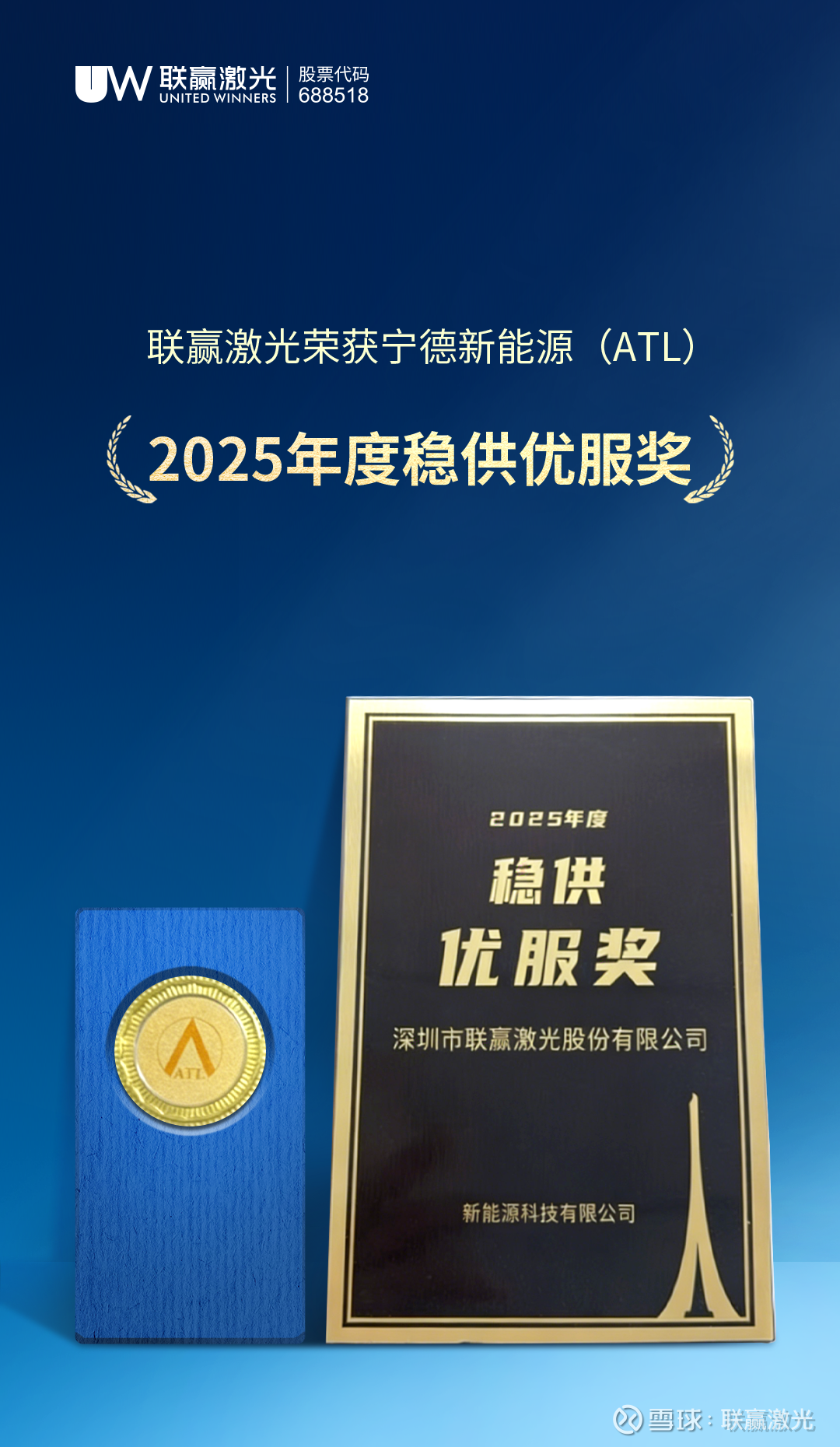 除宁德时代外,联赢激光在消费电池领域亦持续深化与头部客户的协同协作。近期,凭借在供应链稳定交付与服务体系方面的扎实表现,公司荣获宁德新能源(ATL)颁发颁发的“2025年度稳供优服奖”。该奖项聚焦于供应链韧性、交付保障与客户服务等多维能力,进一步体现联赢激光在复杂市场环境下高效响应客户需求、保障产能落地的综合实力,为其在消费类电池领域的持续深耕注入新动能。