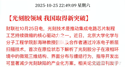 业务布局匹配:2025 年中报披露 “半导体材料业务营收同比增长 52%,子公司上海六迦承接的国家重点实验室光刻胶生产线已完成建设并启动联调”,生产线技术方向与北大团队 “液态薄膜聚合物解析(适配光刻胶制程)” 完全一致。