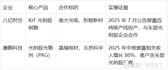上游原材料:与康鹏科技(688609)合作采购光敏剂(PAG),康鹏科技的 PAG 产品通过晶瑞电材 KrF 光刻胶验证并批量供货,2025 年上半年采购额同比增长 80%;与中石化合作开发 KrF 光刻胶专用树脂,已实现国产化替代。