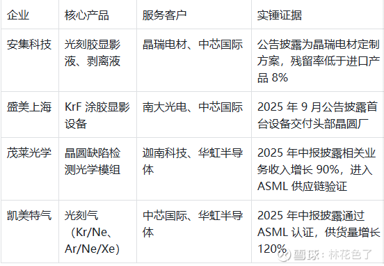 产业链配套端:上游重点关注八亿时空(树脂量产放量),配套设备关注盛美上海(KrF 设备交付节奏),配套材料关注安集科技(显影液市占率提升);