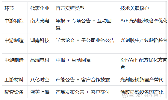 上游原材料:与八亿时空(688181)存在树脂供应合作,八亿时空建成百吨级 KrF 光刻胶树脂产线,产品通过南大光电验证并批量供货。