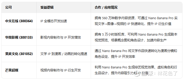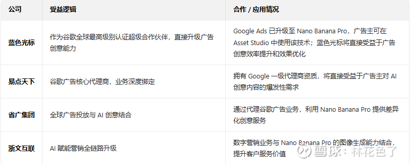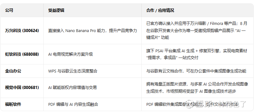 Nano Banana Pro 的推出不仅是谷歌 AI 战略的重要里程碑,也为 A 股相关上市公司带来了巨大机遇。最直接受益的是内容创作工具类和广告营销类公司,其次是电商服务和 IP 开发类企业,而芯片与基础设施提供商则将从长期技术普及中获益。