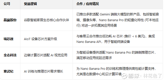 硬件 + 软件整合:晶晨股份等芯片厂商与谷歌 Gemini 生态深度绑定,Nano Banana Pro 的轻量化部署 (可在终端设备本地运行) 为其芯片带来新的应用场景